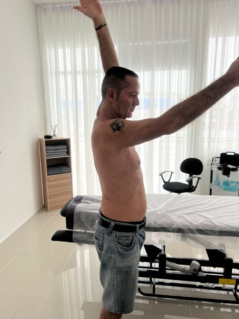 The patient presented to our clinic following surgical treatment for a classic Tossy III acromioclavicular joint injury, reporting persistent pain and significant limitations in shoulder mobility. Initial clinical assessment demonstrated marked restrictions in shoulder flexion, abduction, as well as internal and external rotation. Based on the severity of the functional impairment, a demanding rehabilitation process was anticipated.